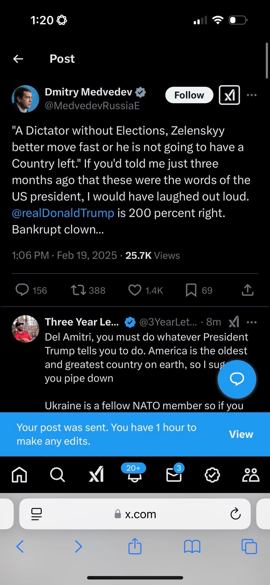 Yesterday, he called Ukraine the aggressor, today he called Zelensky a dictator, and claimed that Russia could be expected to keep the land they got in Ukraine because “it cost them alot of lives to get it.” Moscow is shocked, and wondering if they are dreaming. In the words of the former Russian President now Putin stooge: