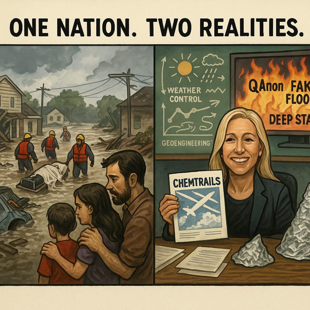 As Texans drown, Greene pushes “weather manipulation” bills—proof that fringe theories now drive Republican politics.