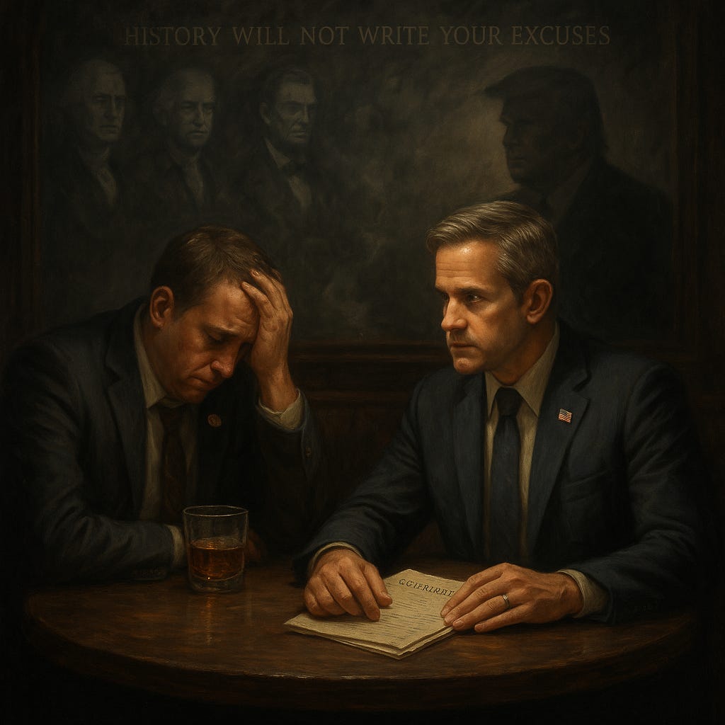 What follows is fiction. A composite conversation, imagined in a dimly lit bar. But if you’ve spent time in Washington, you’ll recognize the voices. The excuses are real, the fear is real, and the cowardice is real. I was inspired to write this after reading that Congress voted to form another committee to investigate our work on the January 6th committee, knowing a full 2/3rds would have voted no in a secret ballot. But alas…
